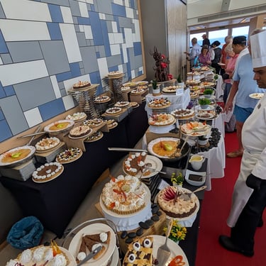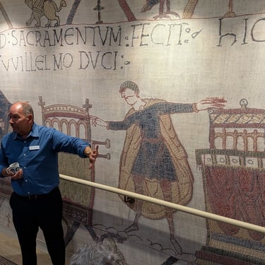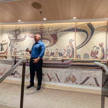 There have been a few more sea birds flying near the ship. We attended a lecture on Pelagic Birds. Pelagic birds are specialized seabirds that spend most of their lives on the open ocean, far from land, only coming ashore to breed on remote islands or cliffs. We also attended a stairwell tour of the history of the Bayeux tapestry. All of the stairwells in the ship have magnified reproductions of the tapestry. The Bayeux Tapestry is a nearly 70-meter (230 ft) long yet only about 20 inches tall and consists of embroidered linen cloth depicting the events leading to the Norman Conquest of England in 1066, culminating in the Battle of Hastings. This was a very interesting talk and we are hoping to see the actual tapestry in London in October before we go on our next cruise as it will be on loan to the British museum while it's normal location is being refurbished in France.