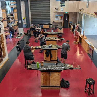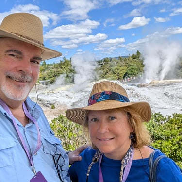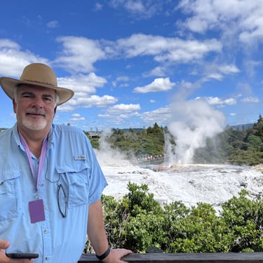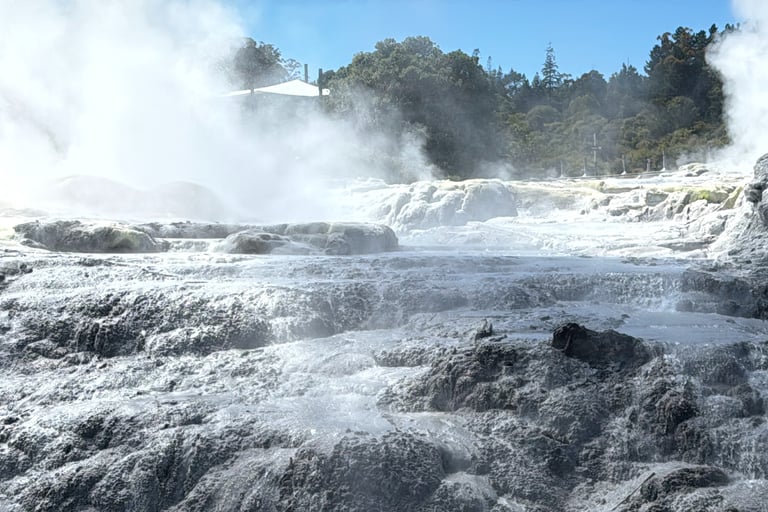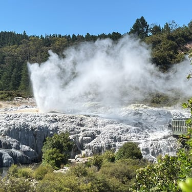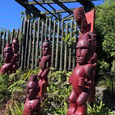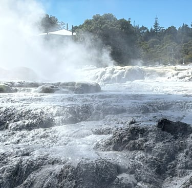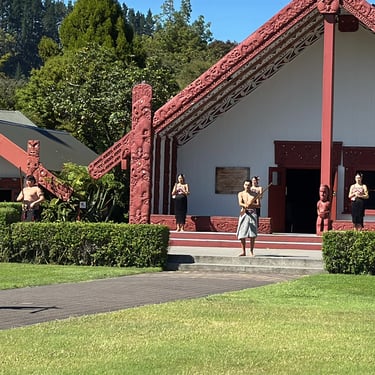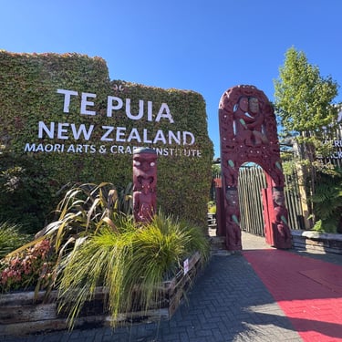 Our tour today was fantastic! It started with an hour long bus ride to a Maori Cultural Center. The first part of our tour included participating in a Māori customary meeting, or pōwhiri. This is a formal, sacred ritual of encounter held on a marae (meeting ground) to welcome visitors. After that we were welcomed into their meeting house where they sang and danced for us and introduced us to many of their customs. This place is also a geothermal preserve and Kiwi habitat, so we were able to see three Kiwi (in captivity). They are nocturnal birds and are being wiped out by animals like dogs, cats, ferrets and rats that the settlers brought over and despite conservation efforts, they are losing about 2% of the population each year. We were not allowed to take pictures in their nocturnal environment. We then saw the geothermal geysers, which the Maori people used for cooking. Just fantastic. After, we visited Te Puia, the Maori Arts & Crafts Institute , where we learned more about the Maori art forms especially carving and weaving. The trip included lunch and it was delicious. They had a buffet with lots of wonderful foods including traditionally cooked meets. Hāngī is a traditional New Zealand Māori method of cooking food using heated rocks buried in a pit oven. On the way back, our bus driver went by Kiwi fruit fields. It takes 2 years to grow kiwis. They build platforms for the kiwis (pictured below). Then, they build sort of tepee looking structures for the vines to grow on. The upper vines on the tepee are immature and they don't pick the fruit from their, only on the bottom of the platform. When it comes time to harvest, they walk beneath the platforms and pick the kiwis on the flat part of the platform. They then collapse the tepees, and those vines will bear fruit the following year.