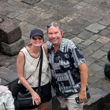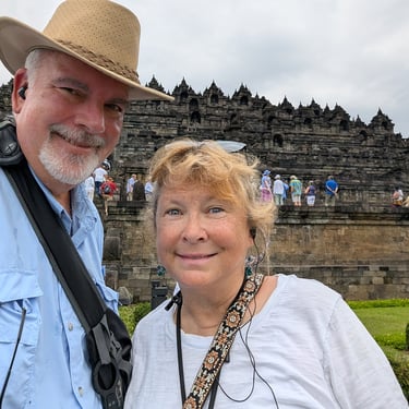 We were the first ones off the boat at 7:15 after we docked in Semarang Java. There were 6 busses waiting for us (and a 7th as a backup just in case) with a police escort to help us get through traffic. This was impressive as cars and trucks pulled over for our caravan. There is no way we could have done this excursion in 9 hours without a police escort. We proceeded out of port and rode for 1 1/2 hours to a coffee & tea rest stop and bathroom break. Coffee, tea and snacks were provided to all in this 1/2 hour stop. We then proceeded for another hour and arrived at Borobudur. After getting our bamboo slippers that allowed us to climb to the top level (no street shoes allowed), we were off to explore and learn with our guide. It was a truly amazing visit. The pictures don't do it justice. The steps were very high and steep, with no railing for the top steps. Some steps were over a foot tall. There were a few medical issues today as one passenger suffered from heat exhaustion and another fell. After our tour, the excursion included a sit down/buffet lunch featuring local cuisine that was wonderful. In Indonesia, on most excursions we were able to sample local fruits which we have never heard of before. At lunch we sat with the resident historian (Bryan Babcock) on the ship and his fiance, and had many conversations about the history of the site and world travels in general.