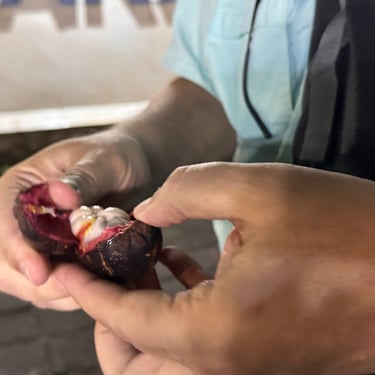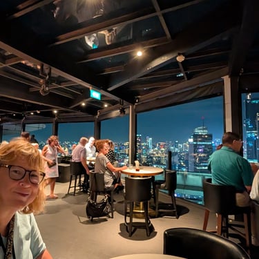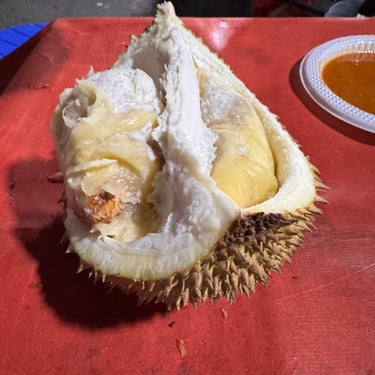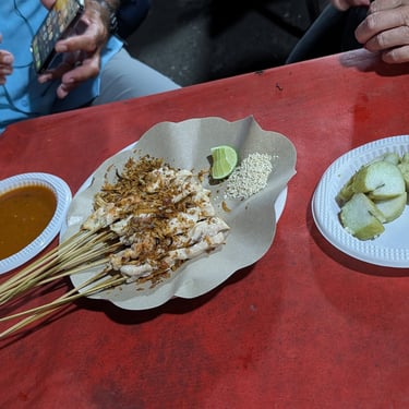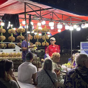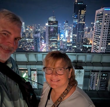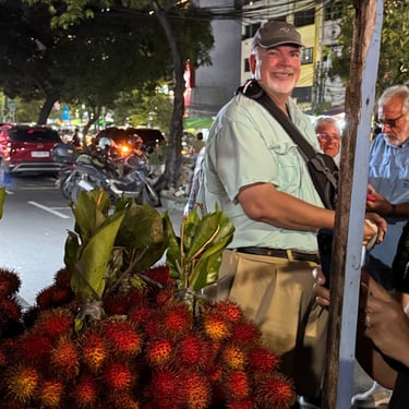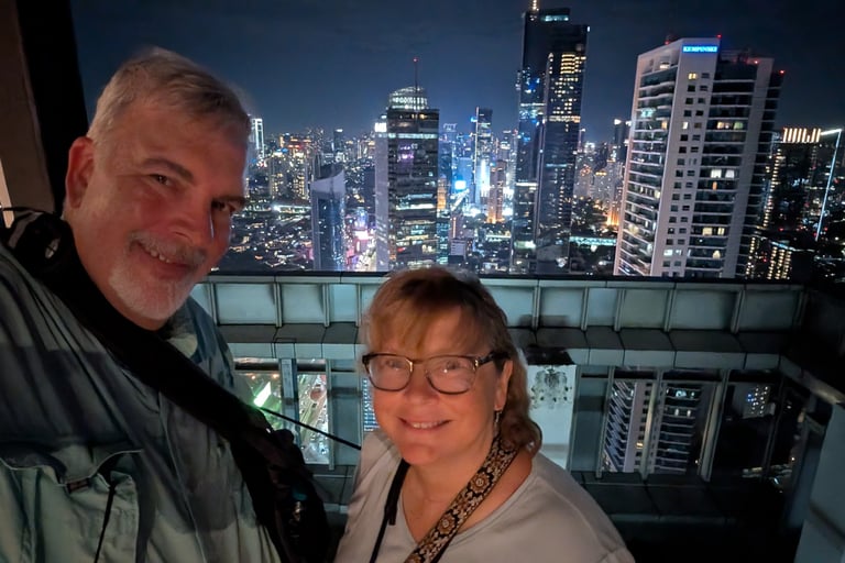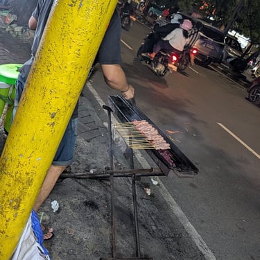 We took the ship provided shuttle to downtown and explored a mall, procuring a few items that we needed. After returning to the ship and resting up a bit, we then proceeded out after 7 pm for a night walk in the Chinatown section where after 6pm local vendors set up food booths lining the streets. Our guides took us to stalls where we tasted chicken satay with crispy onions, lime and hot sauce. Very tasty. Next we tried Durian, a very stinky fruit. They actually provided us gloves to wear when handling the fruit. The smell wasn't as bad as we thought it would be, the taste was slightly sweet with a soft, mushy texture. Many describe the odor similar to Limburger cheese. We saw vendors that had live cobras for sale (we didn't try them). We tried the fruit "rambutan" (which looks like a Lychee but less sweet and a little firmer). We finished with some fresh marinated fried chicken. We were then whisked off to to a downtown high rise and up to the 49th floor for a buffet dinner and live music overlooking the city that was sparkling. We arrived back at the ship at 11:45 pm and with little sleep proceeded out at 7am for another walking tour of Chinatown and old Jakarta.