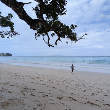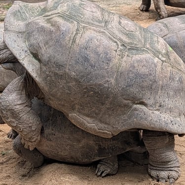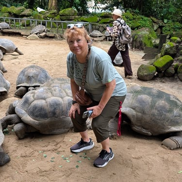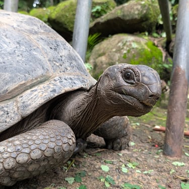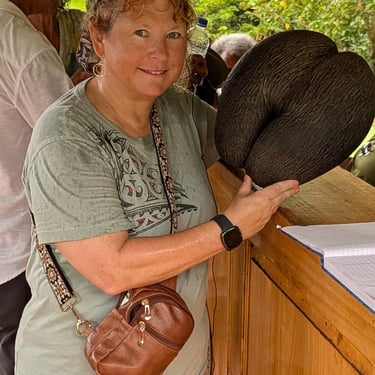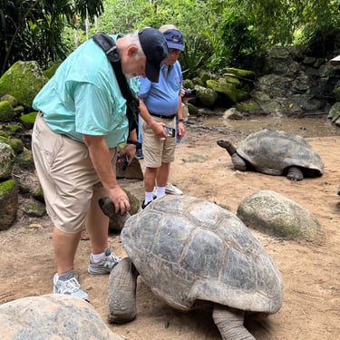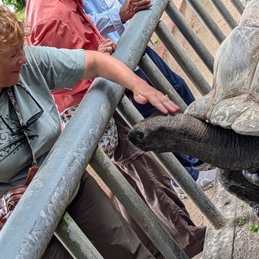 Our final stop was the Botanical Gardens, which turned out to be a highlight of the day. Rather than formal landscaping, the gardens showcase a variety of native plants and wildlife, giving them a more natural, immersive feel. There was also a larger tortoise enclosure that visitors could walk into, offering a closer (but careful!) interaction with these fascinating creatures. It was an experience that definitely exceeded our expectations. One of the pictures below is of Amy holding a seed from a "Coco de Mer" palm tree, native to the Seychelles. It is the world's heaviest seed and can weigh as much as 40 kilos. It is not a coconut and this seed takes about 7 years to mature.