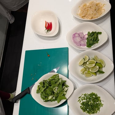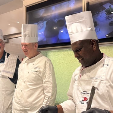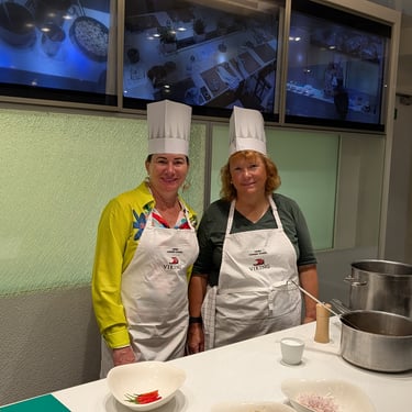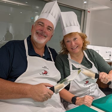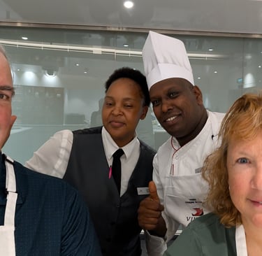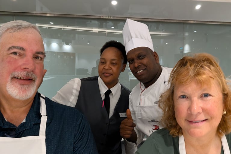 These two days at sea settled into an easy, familiar rhythm; exactly the kind of pace we’ve come to love on a cruise. Mornings began with lively rounds of Mahjong with fellow passengers and an engaging lecture titled “Welcome to Africa – Not What You Would Expect,” which offered plenty of thought-provoking insights. We each found our own ways to stay active: Amy spent time in the fitness center, while Tom made a daily ritual of walking laps around the deck, soaking in the endless ocean views. As always, the food was a highlight. March 17th brought a festive twist for Saint Patrick’s Day, with the ship hosting a special lunch in the World Cafe featuring hearty Irish classics and plenty of beer to match. That evening, we enjoyed dinner with Gisela and Jeff from South Carolina at the Casual Restaurant. Great company paired with great food. The second night was something truly special: a hands-on cooking class held in an intimate space known as “The Kitchen,” tucked behind the specialty restaurants on Deck One. With just eight participants, we worked closely with Sous Chef Joseph and Tatenda, who guided us through preparing an unforgettable meal. We rolled up our sleeves to help create a rich and comforting pho ga (chicken noodle soup) and a perfectly cooked soy-glazed flank steak. Dessert was a caramel tapioca mousse paired with a ginger cookie, a sweet finish to an already incredible evening. Best of all, we were given the recipes, and recreating that pho at home is now high on our list; it was that delicious.